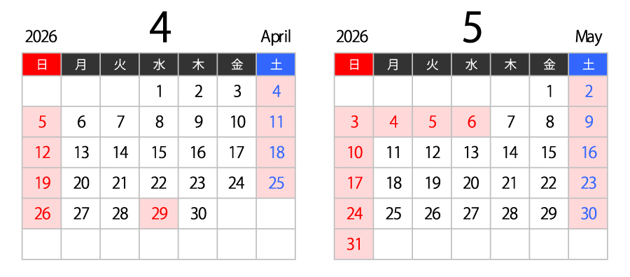 2026年4月29日(水)、2026年5月2日(土)~2025年5月6日(水)